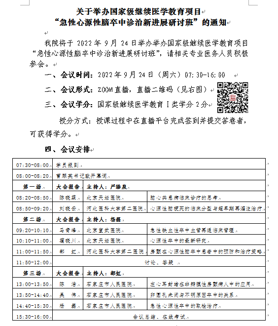 關(guān)于舉辦國家級繼續(xù)醫(yī)學(xué)教育項目 “急性心源性腦卒中診治新進展研討班”的通知