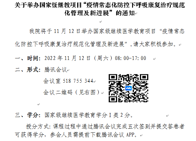 關(guān)于舉辦國(guó)家級(jí)繼教項(xiàng)目“疫情常態(tài)化防控下呼吸康復(fù)治療規(guī)范化管理及新進(jìn)展”的通知