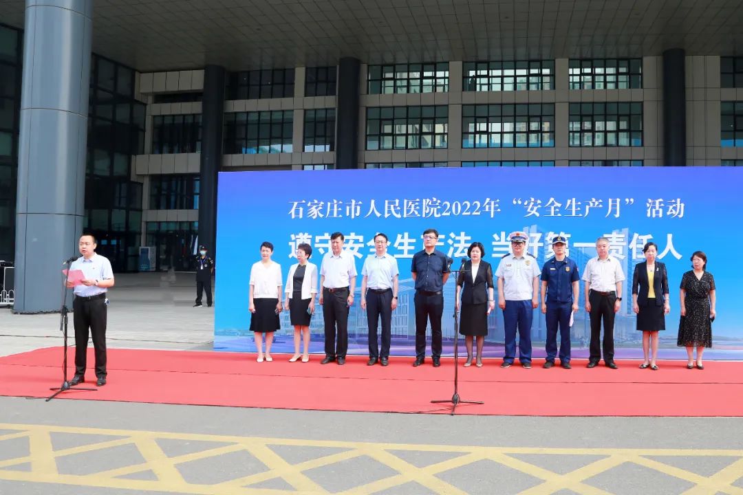 2022年6月是全國第21個“安全生產(chǎn)月”,主題是“遵守安全生產(chǎn)法 當好第一責任人”。正值全國安全生產(chǎn)宣傳咨詢?nèi)眨?月16日,市人民醫(yī)院舉行2022年“安全生產(chǎn)月”啟動儀式,黨委書記曹琴英、院長趙玉斌及部分醫(yī)院領(lǐng)導,裕華區(qū)消防救援大隊參謀王琪珉,建華東路消防救援站站長陳明,醫(yī)院行政職能科室負責人,臨床、醫(yī)技安全員及消防隊員等參加。儀式由副院長安雄彪主持。