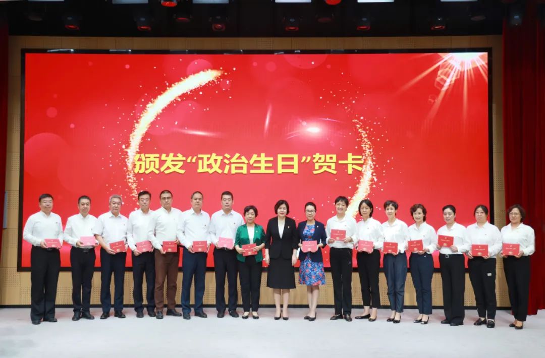 紅星和黨徽熠熠生輝,認(rèn)可和祝福,激勵(lì)黨員更加奮力前行。曹琴英書記為滿五十年黨齡的老黨員頒發(fā)“光榮在黨50年”紀(jì)章,為第十六黨支部頒發(fā)“五好黨支部”獎(jiǎng)牌,為七月入黨的黨員代表頒發(fā)“政治生日”賀卡。