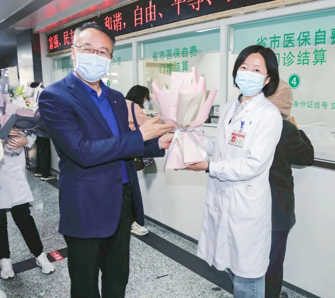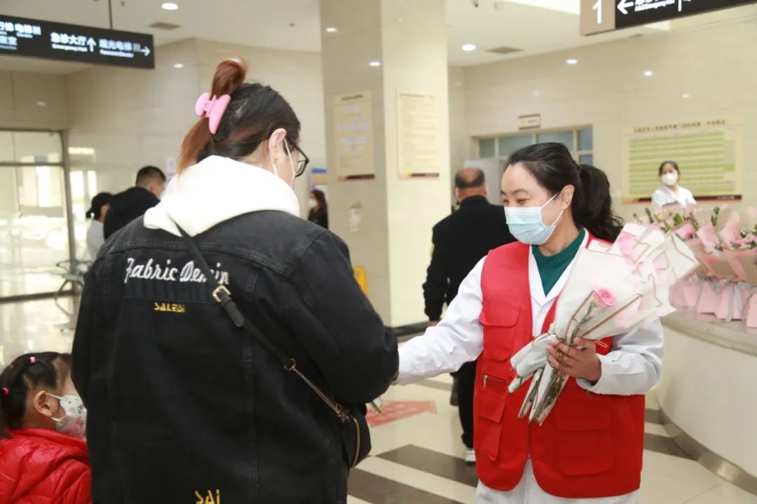 一束鮮花、一聲問候、一句祝福。在方北院區(qū)、范西路院區(qū)門診,院級領(lǐng)導(dǎo)張繼衛(wèi)、張振平、趙會穎把一束束鮮花送到了女性醫(yī)務(wù)工作者手中,暖人話語伴著花香,駐進心中,快樂的氛圍層層環(huán)繞,所到之處充滿歡聲笑語。