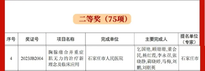 石家莊市人民醫(yī)院重癥肌無力診療中心主任乞國艷主持完成的研究課題《胸腺瘤合并重癥肌無力的治療新理念及臨床應(yīng)用》榮獲2023年度河北省科技進(jìn)步二等獎(jiǎng);合作課題《基于放療的食管鱗癌個(gè)體化精準(zhǔn)治療關(guān)鍵技術(shù)創(chuàng)新與轉(zhuǎn)化性臨床應(yīng)用》榮獲2023年度河北省科技進(jìn)步三等獎(jiǎng)。這是我院第三次榮獲河北省科技進(jìn)步二等獎(jiǎng)。