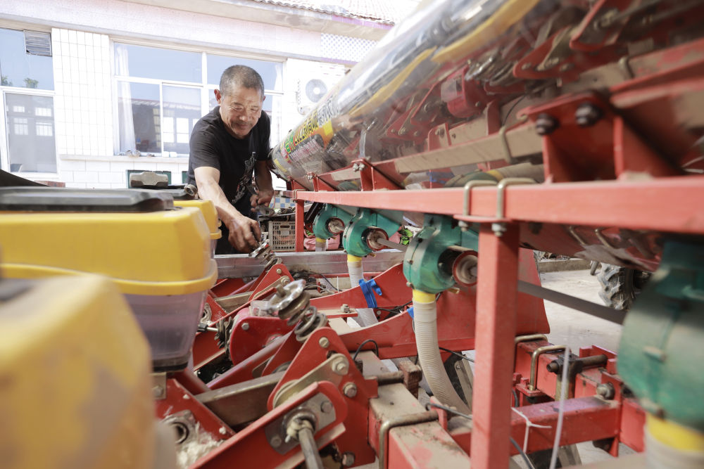 6月2日,在河北省石家莊市深澤縣一家農(nóng)機(jī)銷售點,工作人員安裝播種機(jī)。新華社發(fā)(張曉峰攝)