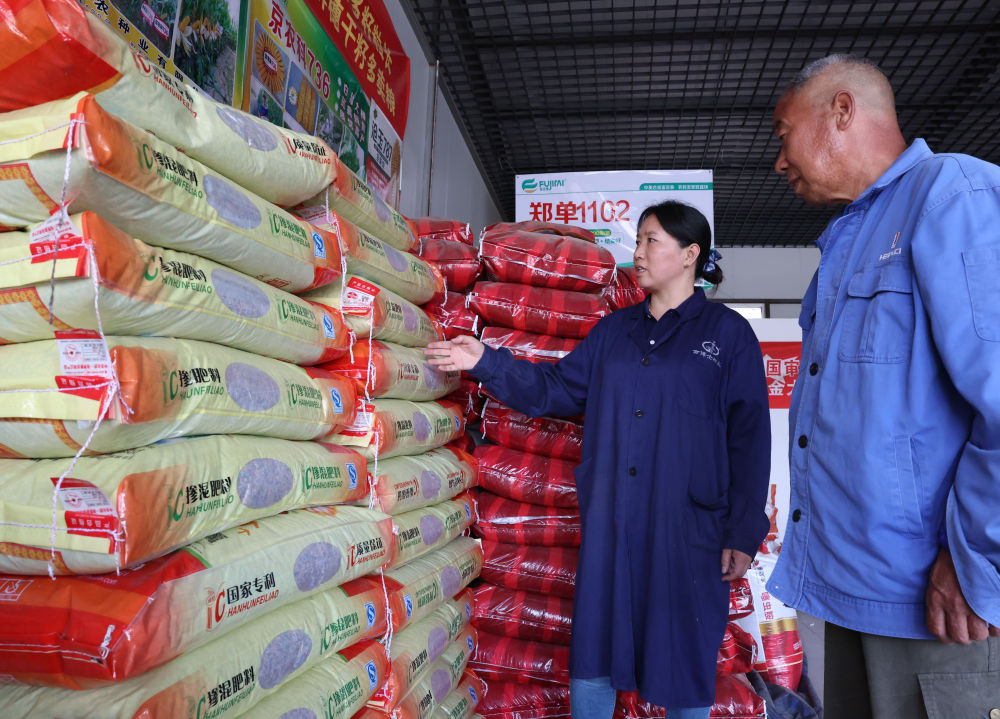 6月3日,河北省晉州市一家種子銷售站的工作人員(左)向采購種子的農(nóng)民介紹玉米種子的特點。新華社記者 楊世堯 攝