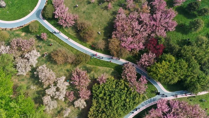 4月9日,游客在河北省石家莊市欒城區(qū)櫻花公園休閑游玩(無(wú)人機(jī)照片)。新華社記者 駱學(xué)峰 攝