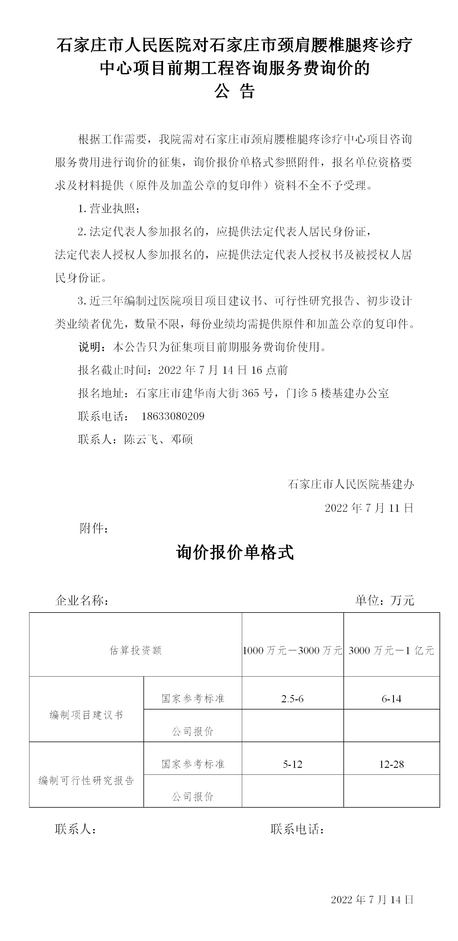 石家莊市人民醫(yī)院對石家莊市頸肩腰椎腿疼診療中心項目前期工程咨詢服務(wù)費(fèi)詢價的 公 告