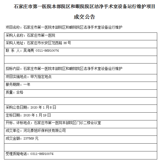 石家莊市第一醫(yī)院本部院區(qū)和眼院院區(qū)潔凈手術(shù)室設(shè)備運行維護項目 成交公告
