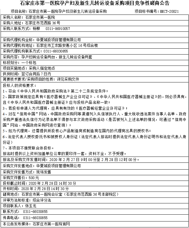 石家莊市第一醫(yī)院孕產(chǎn)婦及新生兒轉(zhuǎn)運(yùn)設(shè)備采購(gòu)項(xiàng)目競(jìng)爭(zhēng)性磋商公告