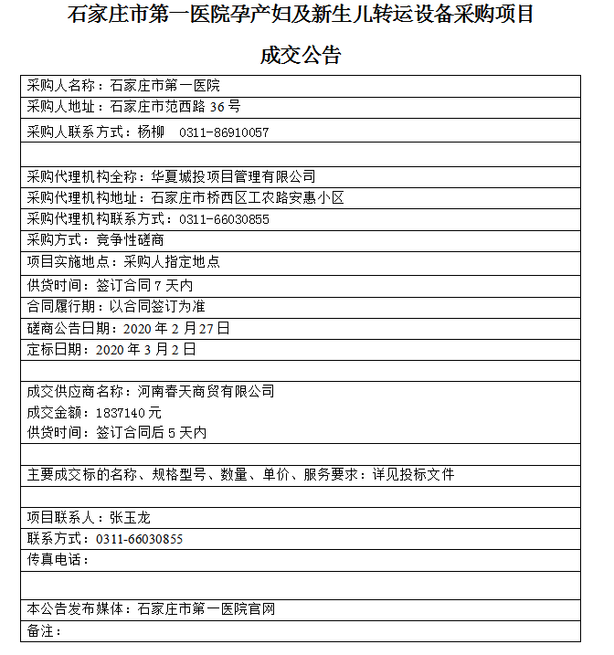 石家莊市第一醫(yī)院孕產(chǎn)婦及新生兒轉(zhuǎn)運(yùn)設(shè)備采購(gòu)項(xiàng)目 成交公告