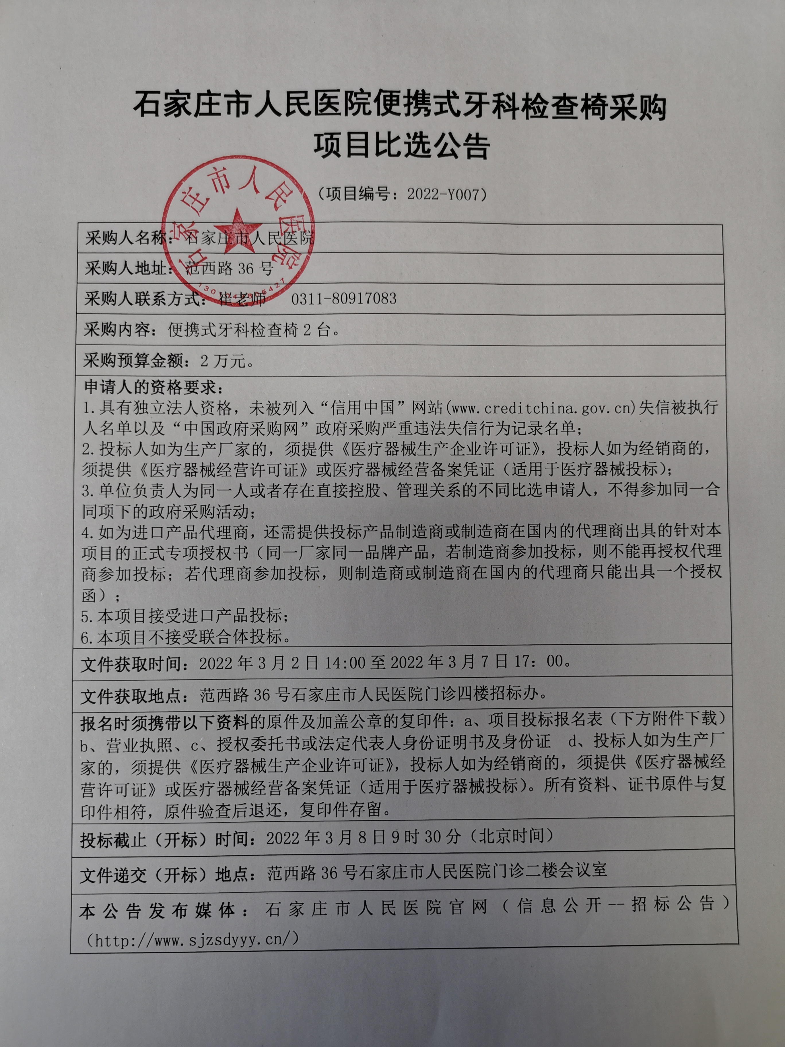 石家莊市人民醫(yī)院便攜式牙科檢查椅采購項目比選公告