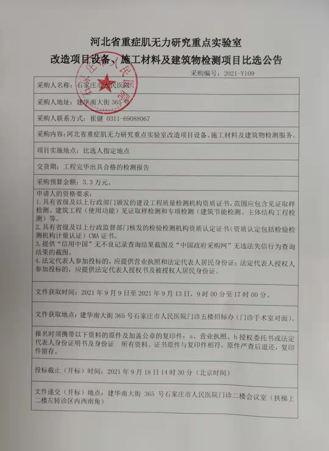 河北省重癥肌無力研究重點(diǎn)實(shí)驗(yàn)室改造項(xiàng)目設(shè)備、施工材料及建筑物檢測項(xiàng)目比選公告