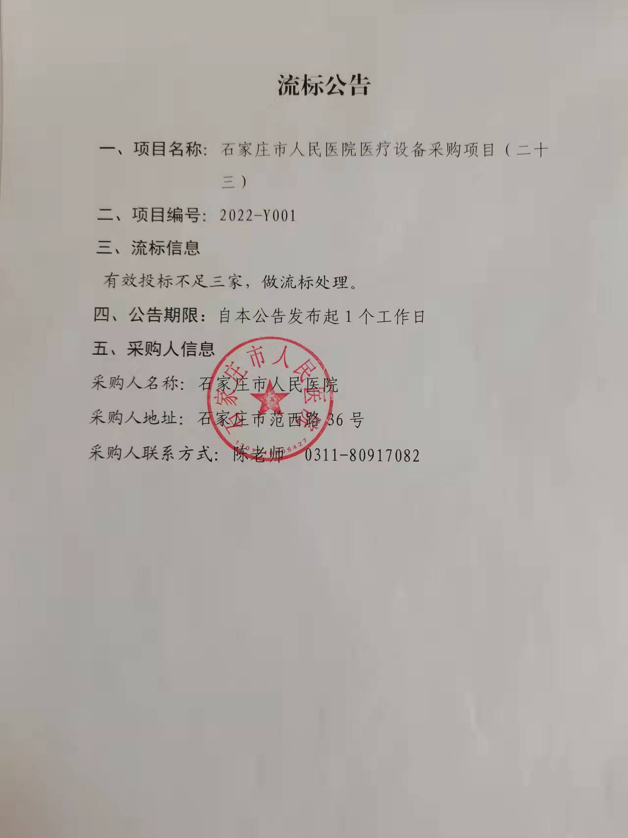 石家莊市人民醫(yī)院醫(yī)療設(shè)備采購項目(二十三)流標(biāo)公告