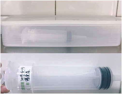 普通注射器打流食時(shí),流食稍微黏稠一些就很容易堵塞。這里的灌食器專為喂食準(zhǔn)備,并且配備統(tǒng)一的存放盒,更密閉更潔凈。