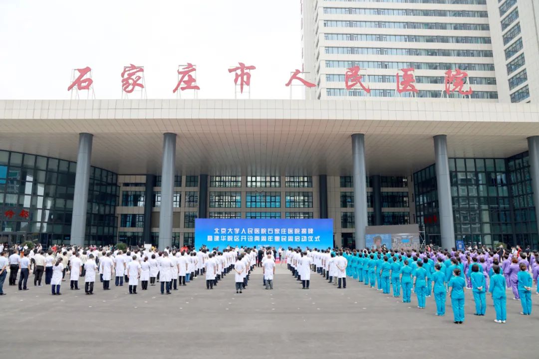莊嚴(yán)的國歌聲中,五星紅旗冉冉升起。北京大學(xué)人民醫(yī)院院旗和石家莊市人民醫(yī)院院旗同時(shí)飄揚(yáng)在醫(yī)院上空,此刻每個(gè)人都無比激動(dòng),心中充滿對(duì)未來的憧憬。