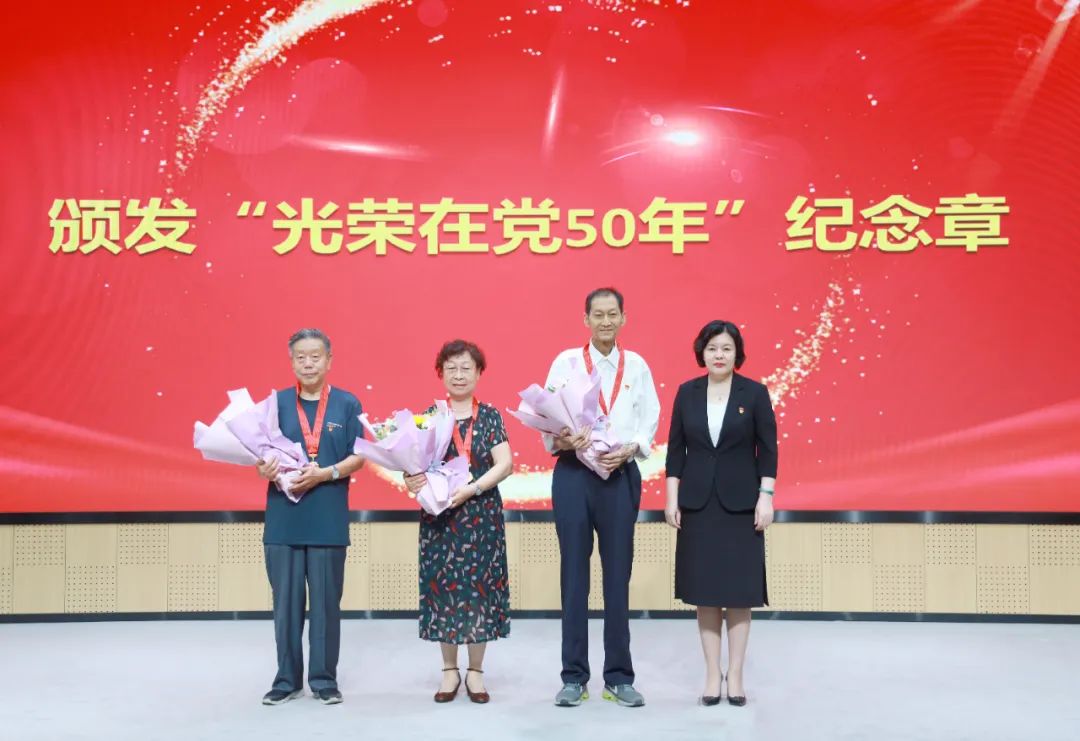 紅星和黨徽熠熠生輝,認(rèn)可和祝福,激勵(lì)黨員更加奮力前行。曹琴英書記為滿五十年黨齡的老黨員頒發(fā)“光榮在黨50年”紀(jì)章,為第十六黨支部頒發(fā)“五好黨支部”獎(jiǎng)牌,為七月入黨的黨員代表頒發(fā)“政治生日”賀卡。