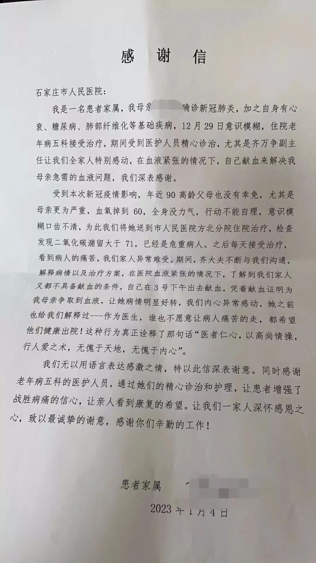 由于部分血液制劑緊張,無(wú)償獻(xiàn)血者可優(yōu)先用血。在這個(gè)緊要關(guān)頭,齊萬(wàn)爭(zhēng)副主任主動(dòng)提出獻(xiàn)血,她趁午休時(shí)間來到獻(xiàn)血點(diǎn),抽血檢驗(yàn)后,獻(xiàn)血400ml。憑借她的獻(xiàn)血證,在醫(yī)院輸血科積極聯(lián)絡(luò)下,省血液中心為王奶奶調(diào)配了寶貴的紅細(xì)胞,解了燃眉之急。