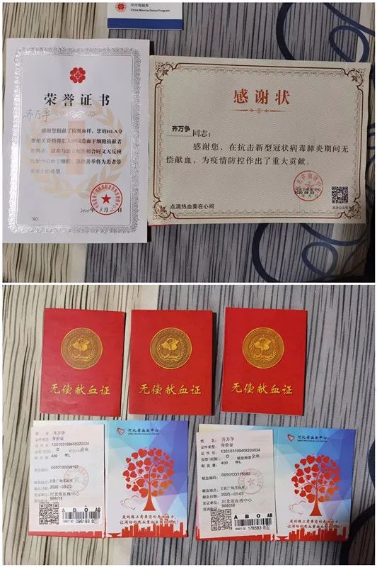 圖為齊萬(wàn)爭(zhēng)的部分獻(xiàn)血證和榮譽(yù)證書