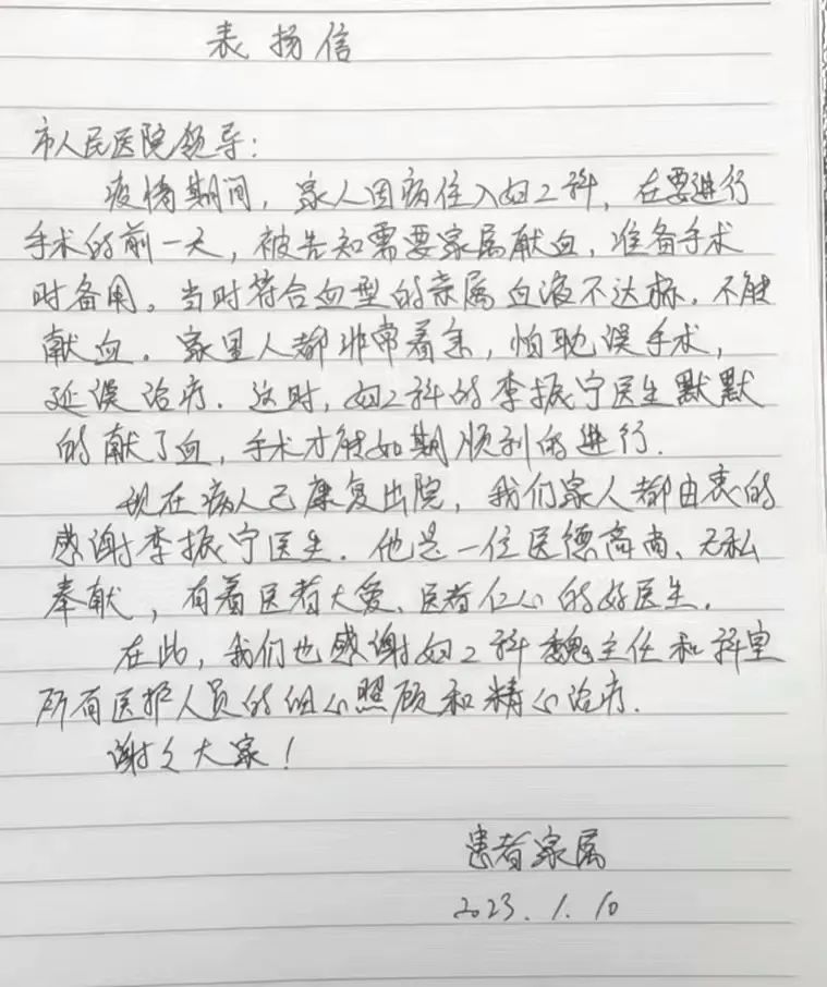 李振寧醫(yī)生自告奮勇:“醫(yī)者仁心,患者家屬不符合獻(xiàn)血條件,我就想做些力所能及的幫助,讓她順利手術(shù)。”這個(gè)實(shí)誠(chéng)的90后小伙子,得知自己達(dá)到感染新冠病毒康復(fù)后獻(xiàn)血標(biāo)準(zhǔn),主動(dòng)去獻(xiàn)血點(diǎn)獻(xiàn)了400ml全血。同樣,在醫(yī)院輸血科的積極聯(lián)絡(luò)下,省血液中心調(diào)配了兩個(gè)單位的紅細(xì)胞,劉大姐的手術(shù)得以順利進(jìn)行。