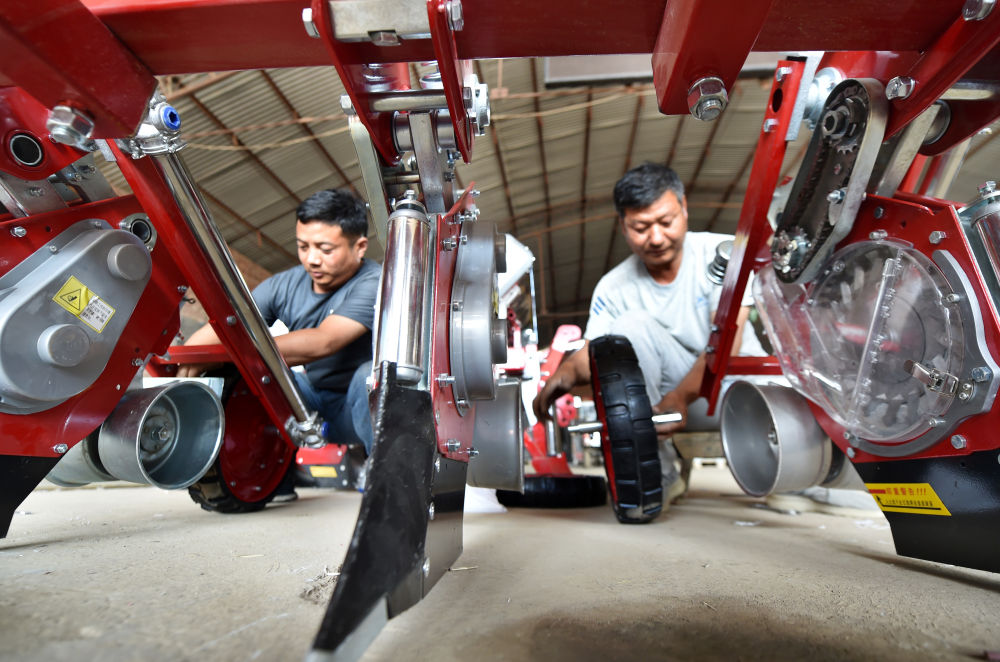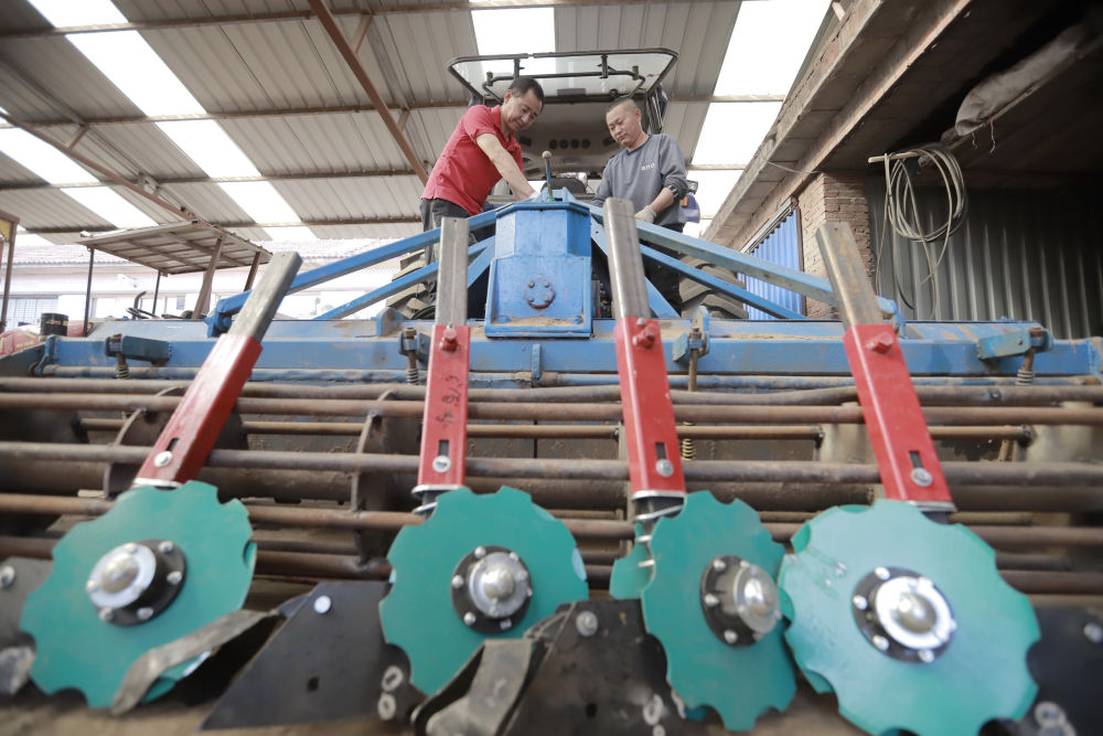6月2日,在河北省石家莊市深澤縣一家農(nóng)機(jī)銷售點,工作人員安裝播種機(jī)。新華社發(fā)(張曉峰攝)