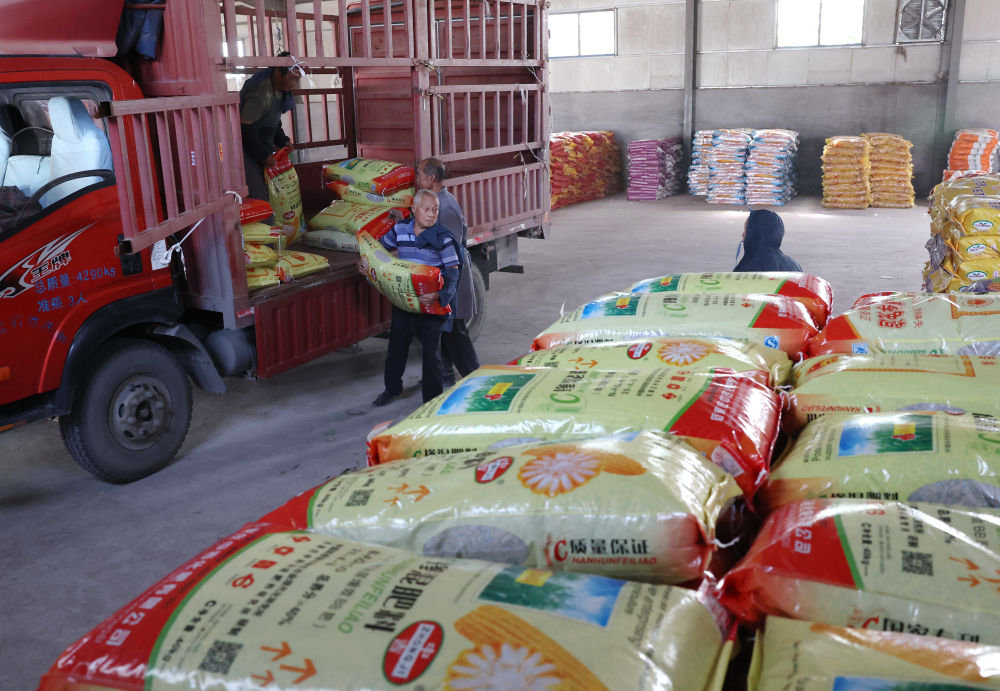 6月3日,河北省晉州市一家農(nóng)資銷售公司的工人在庫房將農(nóng)資卸下車。新華社記者 楊世堯 攝