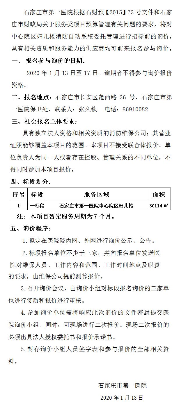 石家莊市第一醫(yī)院關(guān)于中心院區(qū)婦兒樓消防自動(dòng)系統(tǒng)委托管理服務(wù)詢價(jià)公告