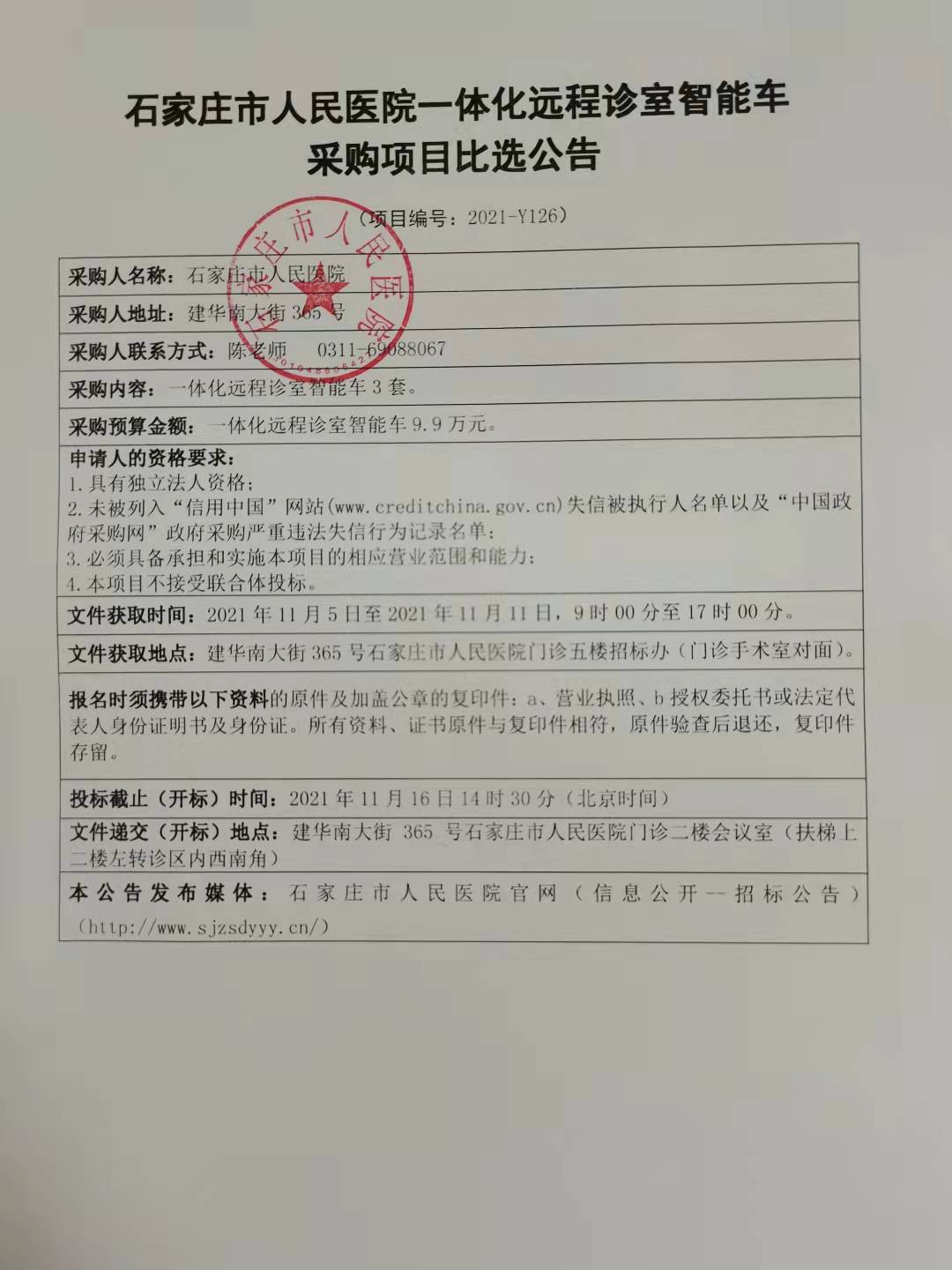 石家莊市人民醫(yī)院一體化遠(yuǎn)程診室智能車采購項(xiàng)目比選公告