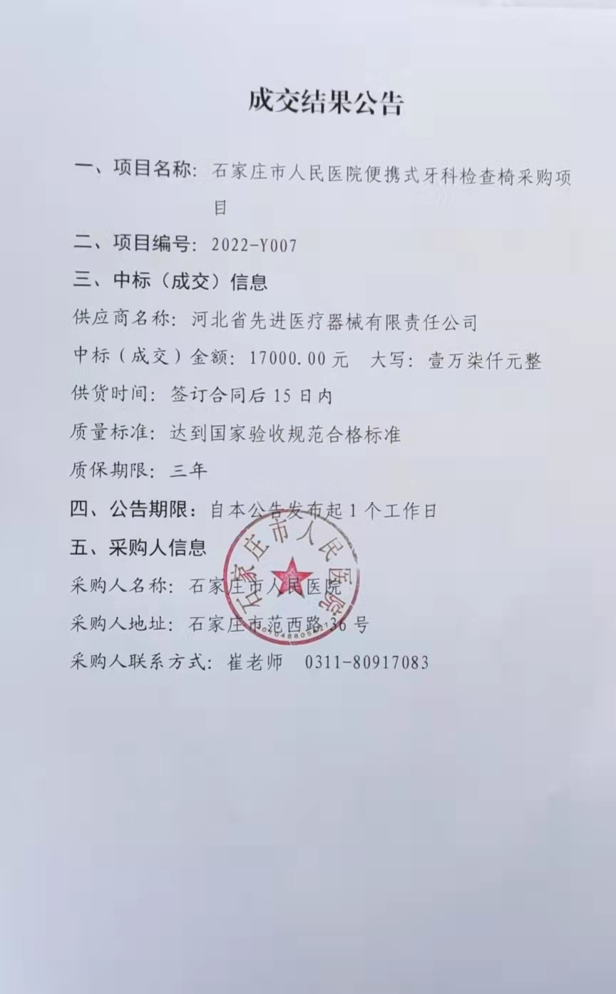 石家莊市人民醫(yī)院便攜式牙科檢查椅采購項目成交結(jié)果公告