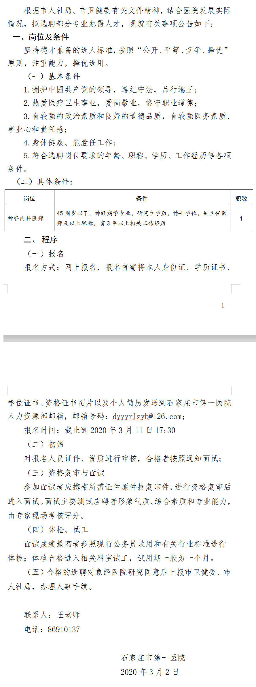 石家莊市第一醫(yī)院 關(guān)于選聘急需人才的公告